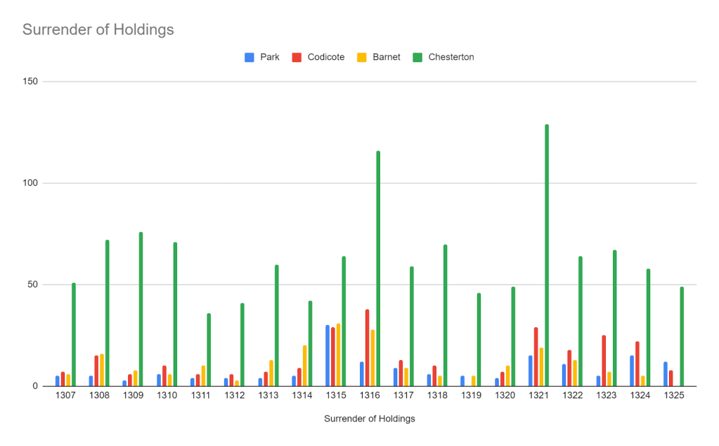 Recent articles suggest that the malnutrition during the Great Famine so weakened the population that the consequences of the Black Death some 33 years later were worse than could have been expected.(DeWitte 2013) Without birth and death registers it is difficult to know the human mortality during the famine and pestilence. On some manors it is possible where the manorial court records survive to compare the number of deaths before, during and after, by counting the number of heriots taken, or the number of tenancies surrendered. These records generally do not refer to the landless, the sub-tenants or the poor who were most likely the biggest sufferers of the famine. However, there are just two manors of the Glastonbury monastery estate where the surviving Hocktide tax lists do show how many men over the age of twelve, who did not hold land, called garciones, were present on the manor, although it requires considerable work to extract the relevant numbers. On one of these manors – Longbridge Deverill, the mortality rate was double the normal in 1316 – 1318, whereas it was normal on the other manor – Monckton Deverill. The mortality rate of the garciones was estimated at about 17 per cent during these famine years, compared with ten to fifteen percent of tenants elsewhere in England.(Ecclestone, 1999) Another estimate is that between one quarter and one half a million people died during the famine.(Campbell, 2006) The number of property transactions recorded in many surviving manor court records shows a very noticeable increase due to either the tenant’s death or his inability to pay debts or having to sell his tenancy to buy food. The following chart shows the number of holdings surrendered on four manors – Park, Codicote and Barnet, Herts, and Chesterton, Cambs. On the manor of Hindolveston, Norfolk belonging to Norwich Cathedral Priory, three times the number of tenancies changed hands compared with average years. As an example which may be typical, Michael Gorman of Codicote surrendered his two pieces of land and one messuage during 1315 to 1317, and by November 1321 he died in poverty as the court roll details – “no heriot because he had nothing.” Of course, the better off tenants could benefit by acquiring these tenancies and build up larger holdings, a free burgage tenant of Codicote acquired twenty-two pieces of land totalling over sixteen acres.(Kershaw, 1976). But mortality was not the only problem for the human population – protein deficiency was most likely during the cattle pestilence with the lack of dairy produce, especially cheese. This can have serious consequences for the young and their development. The dairy provided the largest portion of protein for the poor. Milk production was depressed until 1331 having fallen by as much as eighty per cent, and the ‘protein famine’ for peasants lasted some thirteen years.(Slavin, 2012, p1258)